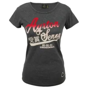 The grey, figure-hugging Ayrton Senna ladies’ shirt captivates with its red and white flock print. The shirt is dedicated to the three world champion titles of Ayrton Senna in 1988, 1990 and 1991 and consists of 95% cotton, 5% spandex. The material and the tight fit offer highest wearing comfort.