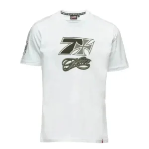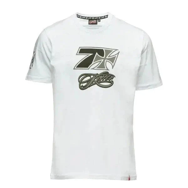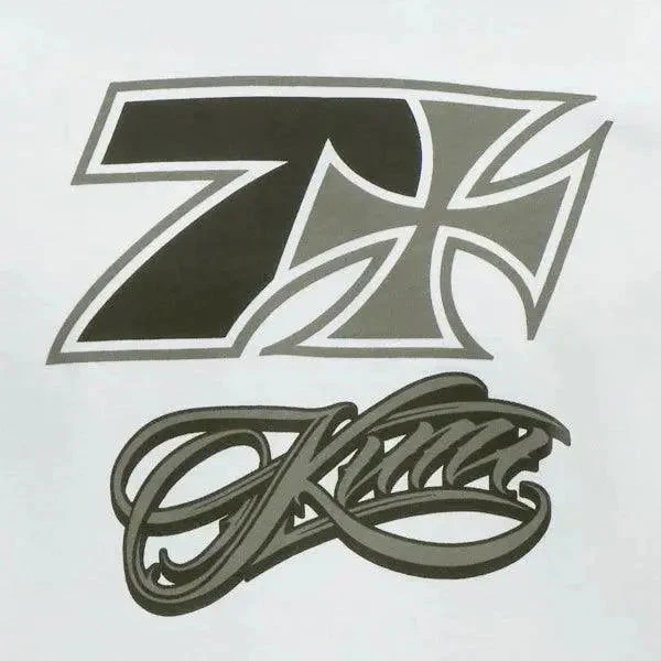 The white Kimi Räikkönen T-shirt “OG” shows the logo “Cross Seven” on the front, a combination of Kimi’s starting number 7 and the cross logo of West Coast Choppers. The back of the shirt picks up this emblem in a larger format and also features Räikkönen’s name. The West Coast Choppers manufacturer’s logo is printed on the left sleeve.
