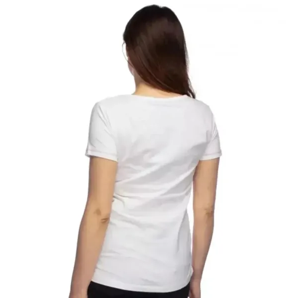 The T-shirt is slightly waisted, with V-neck, in sleeves and neck line with red seams.