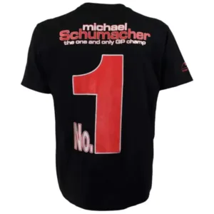 Michael Schumacher T-Shirt with motive print in black. Front and back have a large motif print. Front with Michael Schumacher and the slogan “the one and only GP champ”. The back shows the same slogan with a big No. 1.