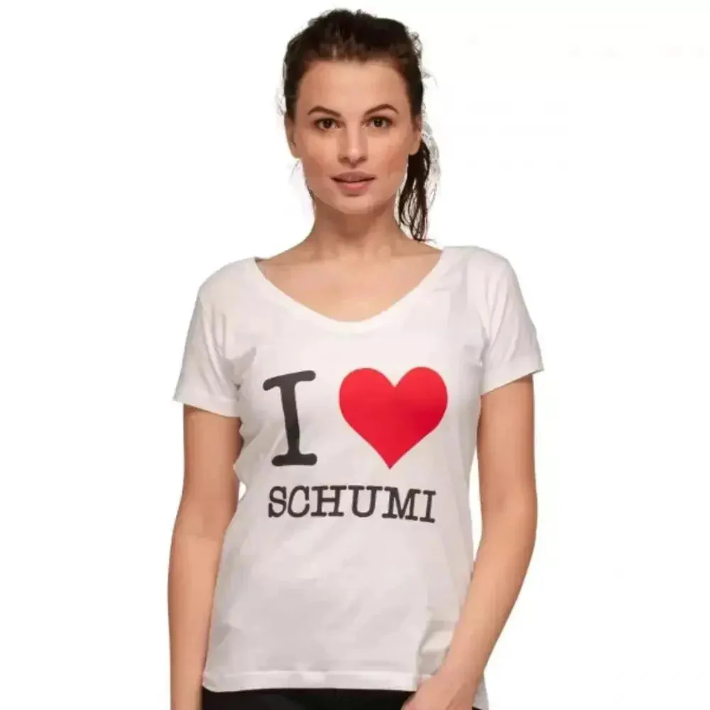 Michael Schumacher ladies t-shirt with high-quality “I Love Schumi” print. Due to the high amount of cotton the white t-shirt is really comfortable to wear.